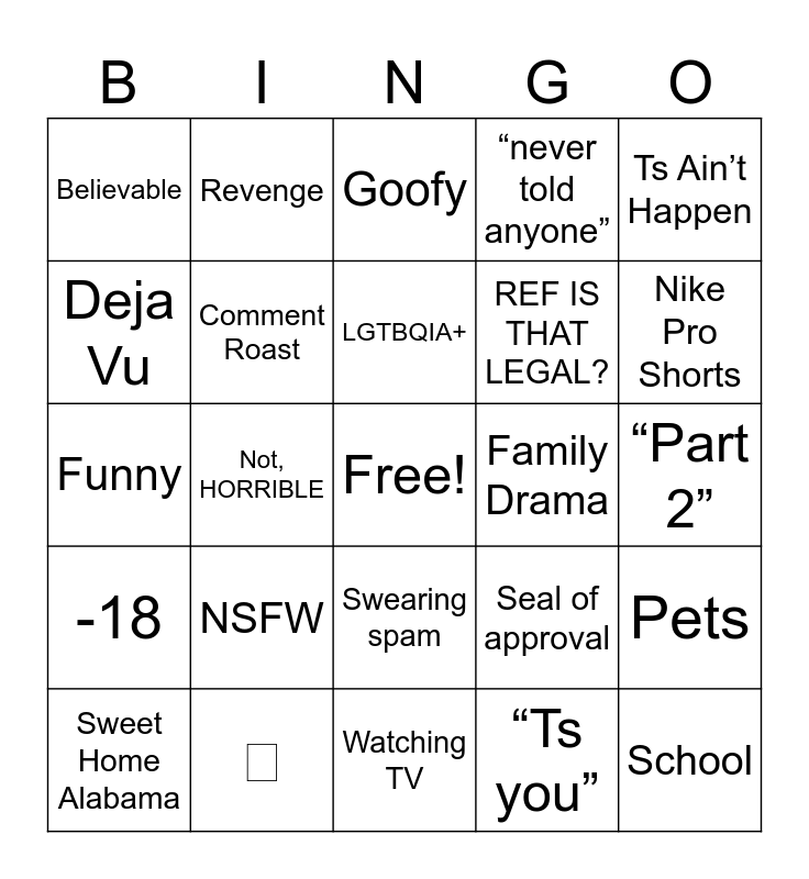 This bingo card has a free space and 24 words: NSFW, 🫩, LGTBQIA+, Sweet Home Alabama, Ts Ain’t Happen, Believable, Deja Vu, Revenge, Family Drama, Swearing spam, REF IS THAT LEGAL?, Funny, Seal of approval, Pets, Comment Roast, “Ts you”, “Part 2”, Goofy, Nike Pro Shorts, Not, HORRIBLE, School, -18, “never told anyone” and Watching TV.