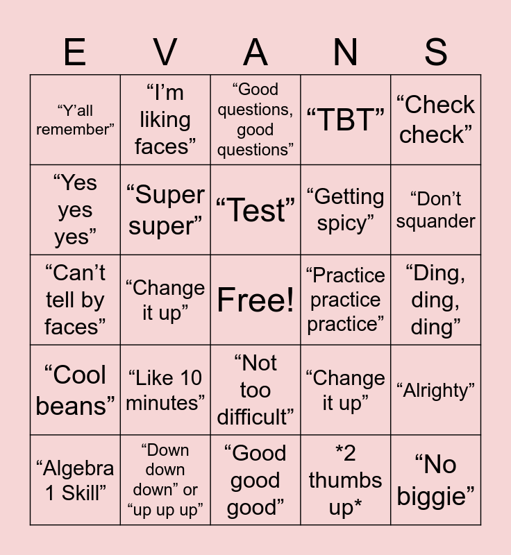 This bingo card has a free space and 29 words: “Algebra 1 Skill”, “Just for fun”, “Change it up”, “Let’s keep going”, “Y’all remember”, “Good questions, good questions”, “Super super”, “Like 10 minutes”, “Practice practice practice”, “Down down down” or “up up up”, “Ding, ding, ding”, “No biggie”, “Good good good”, *2 thumbs up*, “Don’t squander, Delta Math, “Not too difficult”, “Cool beans”, “Check check”, “Can’t tell by faces”, “Change it up”, “Tricky”, “Getting spicy”, “Yes yes yes”, “TBT”, “I’m liking faces”, “Alrighty”, “Test” and “Quiz”.