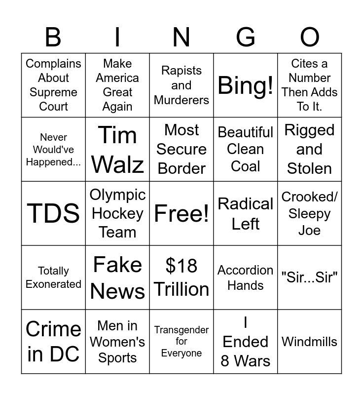 This bingo card has a free space and 24 words: Fake News, Men in Women's Sports, Most Secure Border, Crime in DC, Cites a Number Then Adds To It., Complains About Supreme Court, Never Would've Happened..., Make America Great Again, Radical Left, $18 Trillion, Beautiful Clean Coal, TDS, Accordion Hands, "Sir...Sir", Tim Walz, I Ended 8 Wars, Crooked/ Sleepy Joe, Rapists and Murderers, Rigged and Stolen, Olympic Hockey Team, Windmills, Totally Exonerated, Bing! and Transgender for Everyone.