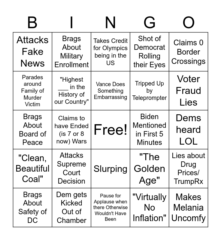 This bingo card has a free space and 24 words: Attacks Supreme Court Decision, Dem gets Kicked Out of Chamber, Vance Does Something Embarrassing, Brags About Safety of DC, Claims 0 Border Crossings, Attacks Fake News, Parades around Family of Murder Victim, Brags About Military Enrollment, Biden Mentioned in First 5 Minutes, Slurping, Tripped Up by Teleprompter, Brags About Board of Peace, "The Golden Age", Lies about Drug Prices/ TrumpRx, "Highest ___ in the History of our Country", "Virtually No Inflation", Dems heard LOL, Takes Credit for Olympics being in the US, Voter Fraud Lies, Claims to have Ended (is 7 or 8 now) Wars, Makes Melania Uncomfy, "Clean, Beautiful Coal", Shot of Democrat Rolling their Eyes and Pause for Applause when there Otherwise Wouldn't Have Been.