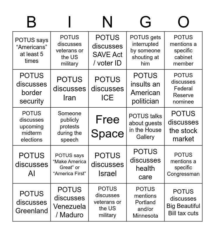 This bingo card has a free space and 24 words: POTUS says “Make America Great” or “America First”, POTUS discusses Venezuela / Maduro, POTUS discusses ICE, POTUS discusses Greenland, POTUS mentions a specific cabinet member, POTUS says “Americans” at least 5 times, POTUS discusses border security, POTUS discusses veterans or the US military, POTUS talks about guests in the House Gallery, POTUS discusses Israel, POTUS insults an American politician, POTUS discusses upcoming midterm elections, POTUS discusses health care, POTUS mentions a specific Congressman, POTUS discusses Iran, POTUS mentions Portland and/or Minnesota, POTUS discusses the stock market, POTUS discusses SAVE Act / voter ID, POTUS discusses Federal Reserve nominee, Someone publicly protests during the speech, POTUS discusses Big Beautiful Bill tax cuts, POTUS discusses AI, POTUS gets interrupted by someone shouting at him and POTUS discusses veterans or the US military.