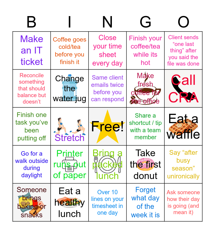 This bingo card has 10 images, a free space and 24 words: Printer runs out of paper, Eat a healthy lunch, Same client emails twice before you can respond, Someone brings baking or snacks, Client sends “one last thing” after you said the file was done, Make an IT ticket, Reconcile something that should balance but doesn’t, Coffee goes cold/tea before you finish it, Share a shortcut / tip with a team member, Bring a packed lunch, Make fresh coffee for the office, Finish one task you’ve been putting off, Take the first donut, Say “after busy season” unironically, Change the water jug, Forget what day of the week it is, Eat a waffle, Close your time sheet every day, Call CRA, Stretch, Ask someone how their day is going (and mean it), Go for a walk outside during daylight, Finish your coffee/tea while its hot and Over 10 lines on your timesheet in one day.