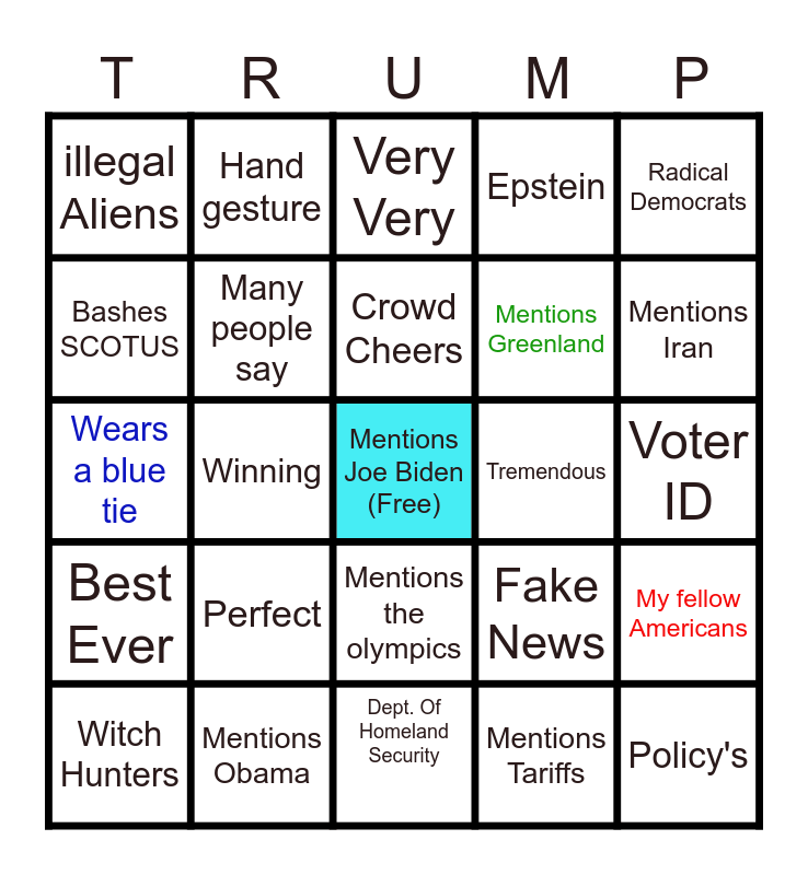 This bingo card has a free space and 24 words: Perfect, Mentions Obama, Crowd Cheers, Witch Hunters, Radical Democrats, illegal Aliens, Bashes SCOTUS, Hand gesture, Tremendous, Mentions the olympics, Mentions Greenland, Wears a blue tie, Fake News, My fellow Americans, Many people say, Mentions Tariffs, Voter ID, Very Very, Mentions Iran, Winning, Policy's, Best Ever, Epstein and Dept. Of Homeland Security.
