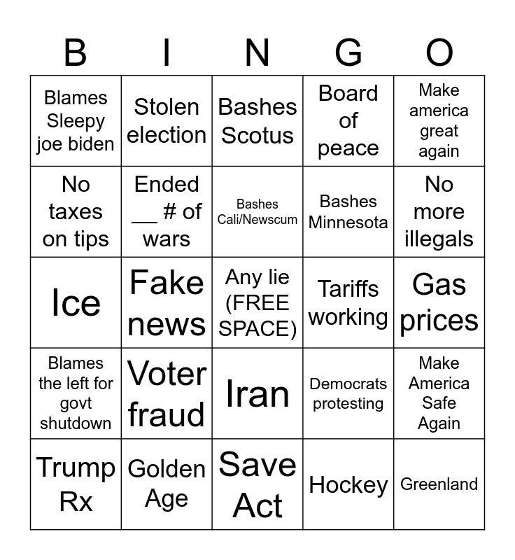 This bingo card has a free space and 24 words: Voter fraud, Golden Age, Bashes Cali/Newscum, Trump Rx, Make america great again, Blames Sleepy joe biden, No taxes on tips, Stolen election, Tariffs working, Iran, Bashes Minnesota, Ice, Democrats protesting, Make America Safe Again, Ended __ # of wars, Hockey, Gas prices, Bashes Scotus, No more illegals, Fake news, Greenland, Blames the left for govt shutdown, Board of peace and Save Act.