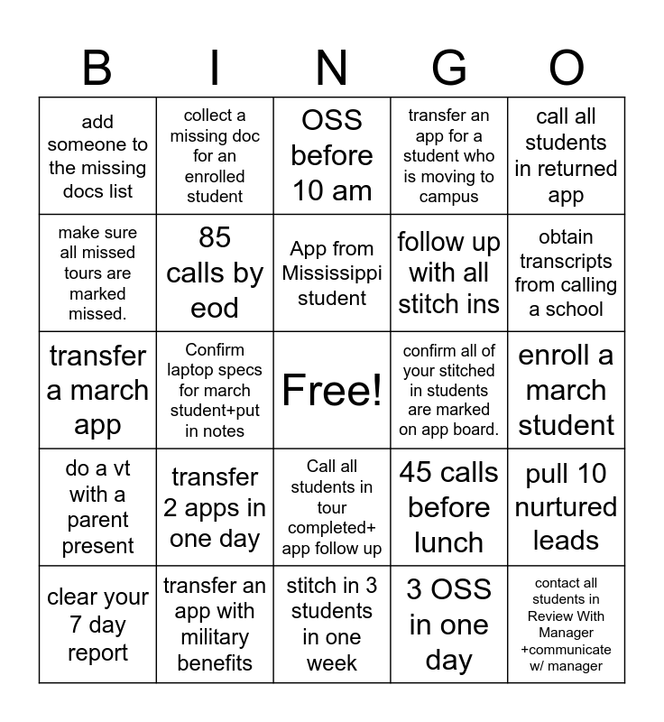 This bingo card has a free space and 24 words: transfer 2 apps in one day, transfer an app with military benefits, App from Mississippi student, clear your 7 day report, call all students in returned app, add someone to the missing docs list, make sure all missed tours are marked missed., collect a missing doc for an enrolled student, confirm all of your stitched in students are marked on app board., Call all students in tour completed+ app follow up, follow up with all stitch ins, transfer a march app, 45 calls before lunch, pull 10 nurtured leads, 85 calls by eod, 3 OSS in one day, enroll a march student, OSS before 10 am, obtain transcripts from calling a school, Confirm laptop specs for march student+put in notes, contact all students in Review With Manager +communicate w/ manager, do a vt with a parent present, transfer an app for a student who is moving to campus and stitch in 3 students in one week.