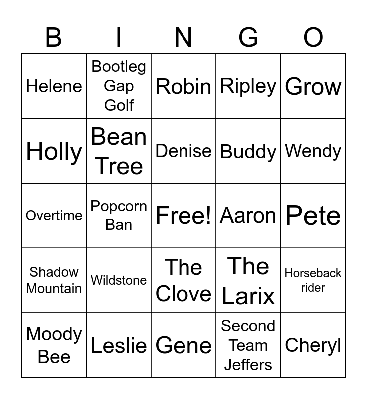 This bingo card has a free space and 34 words: Third team Jeffers, Second Team Jeffers, Fourth Team Jeffers, Lead Team Jeffers, Shadow Mountain, Bean Tree, Grow, Moody Bee, Bootleg Gap Golf, Theckla, Denise, Robin, Blair, Cal, Aaron, Wendy, Leslie, Overtime, Wildstone, The Larix, The Clove, Peter, Helene, Pete, Gene, Cheryl, Ripley, Ryder, Buddy, Holly, Voice over, Popcorn Ban, Horseback rider and Jack.