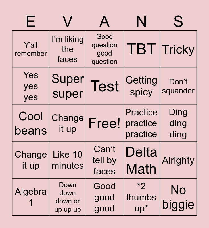 This bingo card has a free space and 29 words: Algebra 1, Just for fun, Change it up, Let’s keep going, Y’all remember, Good question good question, Super super, Like 10 minutes, Practice practice practice, Down down down or up up up, Ding ding ding, No biggie, Good good good, *2 thumbs up*, Don’t squander, Check check check, Can’t tell by faces, Change it up, Tricky, Cool beans, Delta Math, Not too difficult, Getting spicy, Yes yes yes, TBT, I’m liking the faces, Alrighty, Test and Quiz.