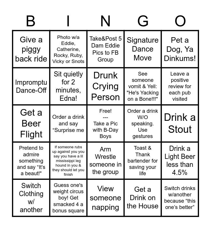 This bingo card has a free space and 87 words: Get a Drink Named After You, 10 Pushups inside a Bar While Quoting a Vacation Movie Line, Arm Wrestle someone in the group, Bark 4 the yak woman Or show someone your dogjaw, Be The Good - Compliment 5 Strangers, Chug a Beer in 5 Seconds, Collect 5 Branded Napkins, Deliver an Eddie dramatic speech no one asked for, Do a Shot with a Stranger, Do Karaoke, Double Fisting Drinks, Drink a Jameson Cocktail, Drink a Light Beer less than 4.5%, Drink a Stout, Drink a Water - You Scoundrel!, Drunk Crying Person, Drunken Philosophical Debate, Eat jello or jelly(of the month) or have a Fruity Drink, Eddie: Complain about something that’s not actually a problem, Find Money on the Ground, Five Selfies with 5 separate Strangers, Free Drink from a Stranger, Get a Beer Flight, Get a Drink Named After You, Get a Drink on the House, Get Carded, Get Digits, Get others to sing a song you spontaneously started, Give an Eddie Toast, Group photo before leaving the bar, Guess one's weight circus boy! Get smacked 4 a bonus square, Have a drink with a Naughty Name, Have a Girly Drink, If someone rubs up against you you say you have a lil mississippi leg hound in you & they should let you finish, Impromptu Dance-Off, Lead the group in a mock "saying grace", Leave a positive review for each pub visited, Make it to 5 Pubs, Mystery Shot, Order a drink and say “Surprise me, Order a drink as Eddie spouting off about the plate in your head, Order a drink that starts with the same letter as your name, Order a Drink using an accent, Order a drink W/O speaking. Use gestures, Order the Cheapest Drink on the Menu, Pet a Dog, Ya Dinkums!, Photo w/a Clark, Ellen, Audrey or Russ, Photo w/a Eddie, Catherine, Rocky, Ruby, Vicky or Snots, Photo w/a New Friend today, Photo with an Eddie, Pic of Loner at the end of the Bar, Play a song on Touch Tunes or AMI, Pretend to admire something and say “It’s a beaut!", Re-enact Eddie explaining "Plate in Head", Respond to a work email while at a pub, See someone drunk before the 3rd pub, See someone vomit & Yell: "He's Yacking on a Bone!!!", Selfie w/ Bartender & Say "Is that real tomato ketchup?", Selfie with a Statue, Signature Dance Move, Sit quietly for 2 minutes, Edna!, Speech: "Kids got mom's looks & dad's sense of balance", Spill a drink (intentional or not - it counts), Spot the Mullet, Spot Visible Underwear (other people), Start an Eddie Chant, Steal someone's Bingo Card, Switch Clothing w/ another, Switch drinks w/another because “this one’s better”, Tag Scott & Thom on Social Media, Take a Group Photo Take a Shot, Take a shot with no hands, Take&Post 5 Dam Eddie Pics to FB Group, Toast & Thank bartender for saving your life, Toast with: “Hallelujah! Holy sh*t! Where’s the Tylenol?”, Touch another's Trapper Hat, View Couple Arguing, View someone napping, Walk off w/friend & say: "Let's go find your sister", Whole Bar Sings Happy Birthday, Witness a Glass Breaking, Yell Outloud “I'm holding out for a management position”, Yell Outloud: “Shitter’s full!” Coming out of bathroom, Drink a +8% ABV Drink, Find a celebrity look alike & take a pic with them, Give a piggy back ride and Respond loudly w/ “I don’t know Margot!” dramatically.