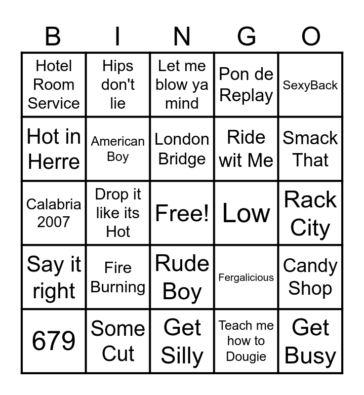 This bingo card has a free space and 50 words: Temperature, Get Busy, Trap Queen, Get Silly, Fire Burning, I don't mind, Hips don't lie, 1,2 Step, Hot in Herre, Crank that, American Boy, Pon de Replay, Candy Shop, Fergalicious, Tipsy, Get Low, London Bridge, Low, Yeah!, SexyBack, Drop it like its Hot, Teach me how to Dougie, Hotel Room Service, Ride wit Me, Promiscuous, BedRock, Smack That, Gasolina, Let me blow ya mind, Rude Boy, Baby Boy, Get Ur Freak On, Right Thurr, Do it to it, Some Cut, Gold Digger, Gas Pedal, Laffy Taffy, Up Down, Rack City, No Hands, Wobble, Bottoms Up, Walk it Out, 679, Calabria 2007, Buy U a Drank, Down on Me, Say it right and The Largest.
