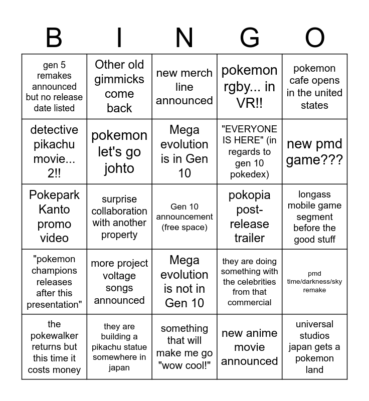 This bingo card has a free space and 24 words: more project voltage songs announced, they are building a pikachu statue somewhere in japan, Mega evolution is in Gen 10, the pokewalker returns but this time it costs money, pokemon cafe opens in the united states, gen 5 remakes announced but no release date listed, detective pikachu movie... 2!!, Other old gimmicks come back, pokopia post-release trailer, Mega evolution is not in Gen 10, "EVERYONE IS HERE" (in regards to gen 10 pokedex), Pokepark Kanto promo video, they are doing something with the celebrities from that commercial, pmd time/darkness/sky remake, pokemon let's go johto, new anime movie announced, longass mobile game segment before the good stuff, new merch line announced, new pmd game???, surprise collaboration with another property, universal studios japan gets a pokemon land, "pokemon champions releases after this presentation", pokemon rgby... in VR!! and something that will make me go "wow cool!".