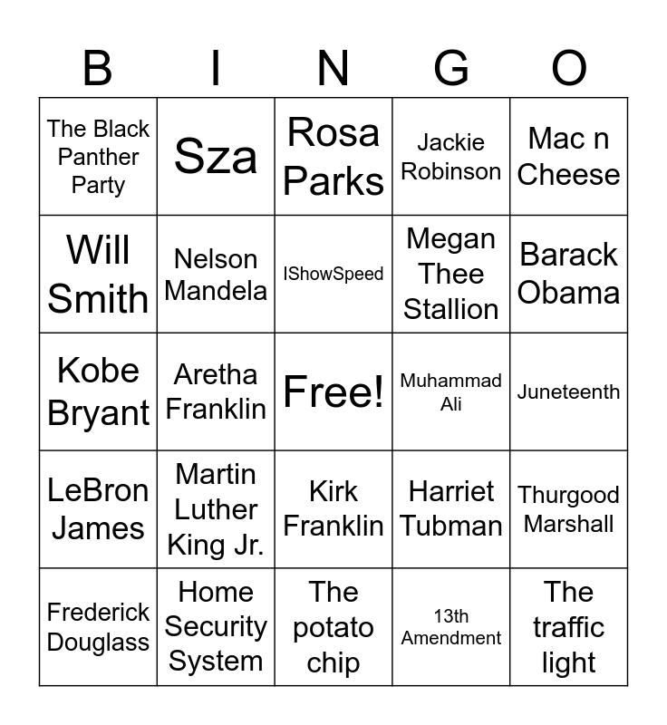 This bingo card has a free space and 49 words: Kendrick Lamar, The traffic light, Zendaya, The potato chip, Martin Luther King Jr., The folding chair, Sza, Maya Angelou, Will Smith, BET, Nelson Mandela, Jackie Robinson, Thurgood Marshall, Harriet Tubman, The Blood Bank, Hidden Figures, IShowSpeed, Muhammad Ali, Madam C.J. Walker, Mac n Cheese, Aretha Franklin, 13th Amendment, The Black Panther Party, Megan Thee Stallion, Serena Williams, Barack Obama, Frederick Douglass, Michelle Obama, Kirk Franklin, LeBron James, Malcolm X, Ruby Bridges, Michael Jackson, Sojourner Truth, Home Security System, Oprah Winfrey, Whoopi Goldberg, Tuskegee Institute, Juneteenth, Mary J. Blige, Tyler Perry, Kamala Harris, NAACP, Simone Biles, Kobe Bryant, Rosa Parks, Quinta Brunson, Cardi B and Chadwick Boseman.