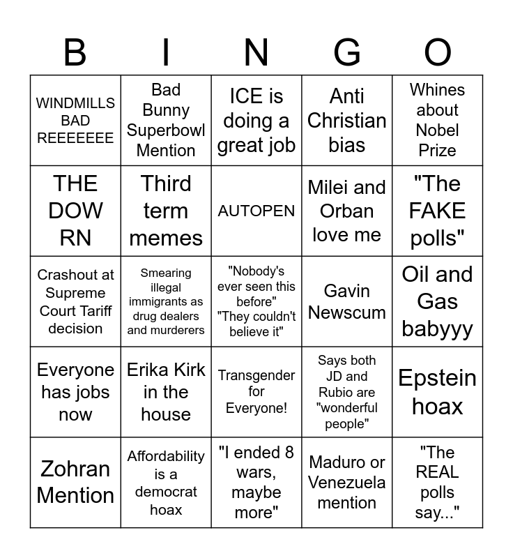 This bingo card has a free space and 24 words: Erika Kirk in the house, Affordability is a democrat hoax, AUTOPEN, Zohran Mention, Whines about Nobel Prize, WINDMILLS BAD REEEEEEE, THE DOW RN, Bad Bunny Superbowl Mention, Gavin Newscum, Transgender for Everyone!, Milei and Orban love me, Crashout at Supreme Court Tariff decision, Says both JD and Rubio are "wonderful people", Epstein hoax, Third term memes, Maduro or Venezuela mention, Oil and Gas babyyy, ICE is doing a great job, "The FAKE polls", Smearing illegal immigrants as drug dealers and murderers, "The REAL polls say...", Everyone has jobs now, Anti Christian bias and "I ended 8 wars, maybe more".
