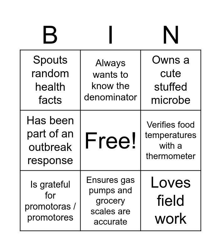 This bingo card has a free space and 17 words: Checks travel notices, Packs mosquito repellant, Owns a cute stuffed microbe, Spouts random health facts, Signs up for every emergency alert system, Has been part of an outbreak response, Collaborates with community partners, Is grateful for promotoras / promotores, Ensures gas pumps and grocery scales are accurate, Verifies food temperatures with a thermometer, Is comfortable discussing diarrhea at dinner, Thinks bats are cool, Loves field work, Always wants to know the denominator, Is passionate about health communication, Show me the data! and Can explain cycle threshold (CT) values.