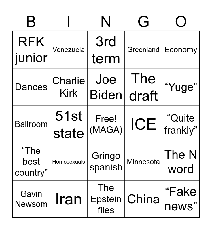 This bingo card has a free space and 29 words: Gavin Newsom, The border, 51st state, Melaina Trump, RFK junior, 3rd term, Charlie Kirk, Homosexuals, ICE, Iran, “Quite frankly”, “Fake news”, The Epstein files, China, “Yuge”, Trump points at someone, Gringo spanish, “The best country”, Economy, Ballroom, Minnesota, Nuclear weapons, The draft, Dances, Greenland, Venezuela, The N word, Joe Biden and Tarriffs.