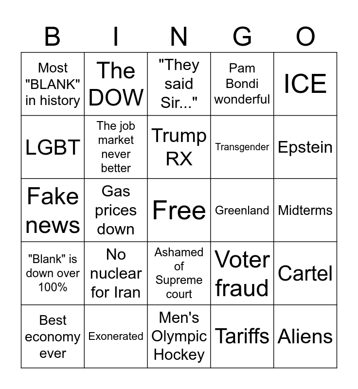 This bingo card has a free space and 24 words: No nuclear for Iran, Exonerated, Trump RX, Best economy ever, ICE, Most "BLANK" in history, LGBT, The DOW, Greenland, Ashamed of Supreme court, Transgender, Fake news, Voter fraud, Cartel, The job market never better, Tariffs, Midterms, "They said Sir...", Epstein, Gas prices down, Aliens, "Blank" is down over 100%, Pam Bondi wonderful and Men's Olympic Hockey.