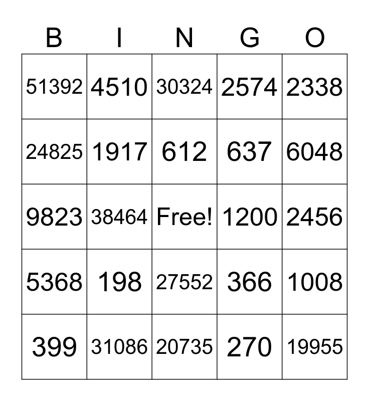This bingo card has a free space and 24 words: 198, 31086, 612, 399, 2338, 51392, 24825, 4510, 1200, 27552, 637, 9823, 366, 1008, 1917, 270, 2456, 30324, 6048, 38464, 19955, 5368, 2574 and 20735.