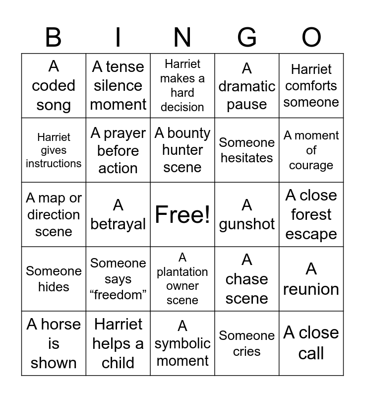 This bingo card has a free space and 24 words: Someone says “freedom”, Harriet helps a child, A bounty hunter scene, A horse is shown, Harriet comforts someone, A coded song, Harriet gives instructions, A tense silence moment, A gunshot, A plantation owner scene, Someone hesitates, A map or direction scene, A chase scene, A reunion, A prayer before action, Someone cries, A close forest escape, Harriet makes a hard decision, A moment of courage, A betrayal, A close call, Someone hides, A dramatic pause and A symbolic moment.