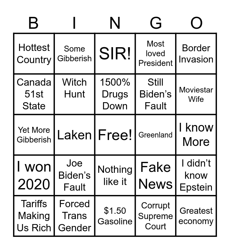 This bingo card has a free space and 24 words: Joe Biden’s Fault, Forced Trans Gender, 1500% Drugs Down, Tariffs Making Us Rich, Border Invasion, Hottest Country, Canada 51st State, Some Gibberish, Greenland, Nothing like it, Still Biden’s Fault, Yet More Gibberish, Fake News, I didn’t know Epstein, Witch Hunt, Corrupt Supreme Court, I know More, SIR!, Moviestar Wife, Laken, Greatest economy, I won 2020, Most loved President and $1.50 Gasoline.
