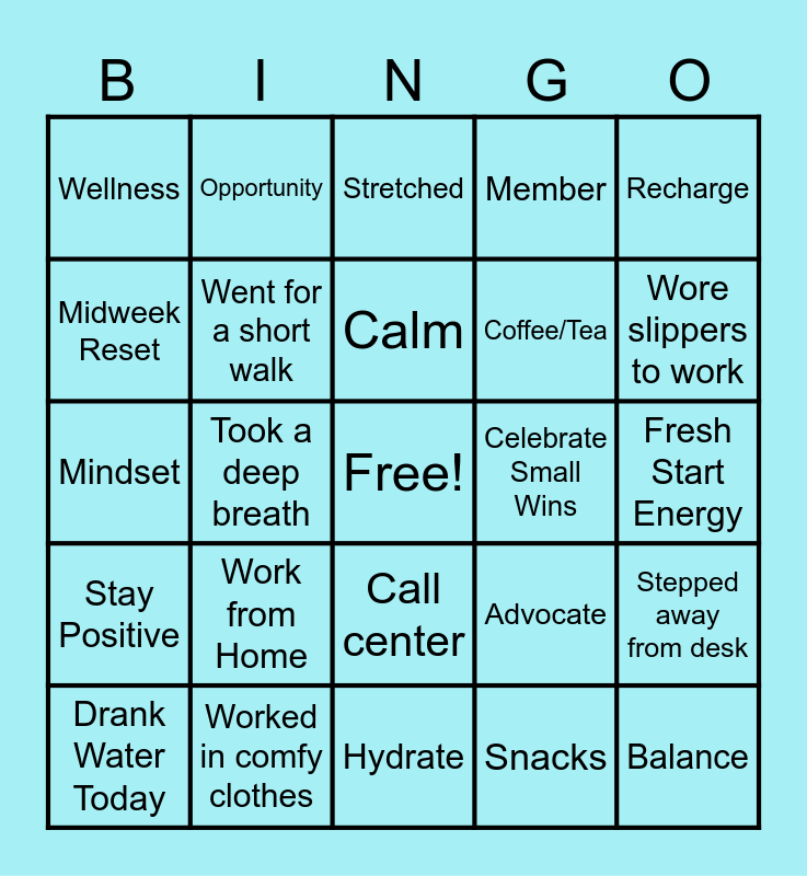 This bingo card has a free space and 29 words: Drank Water Today, Helped a teammate in chat, Took a deep breath, One call at a time, Wellness, Stretched, Went for a short walk, Work from Home, Celebrate Small Wins, Worked in comfy clothes, Fresh Start Energy, Balance, Hydrate, Snacks, Wore slippers to work, Focus, Call center, Stay Positive, Recharge, Mindset, Advocate, Protect your Energy, Coffee/Tea, Midweek Reset, Member, Opportunity, Stepped away from desk, Calm and Happiness.