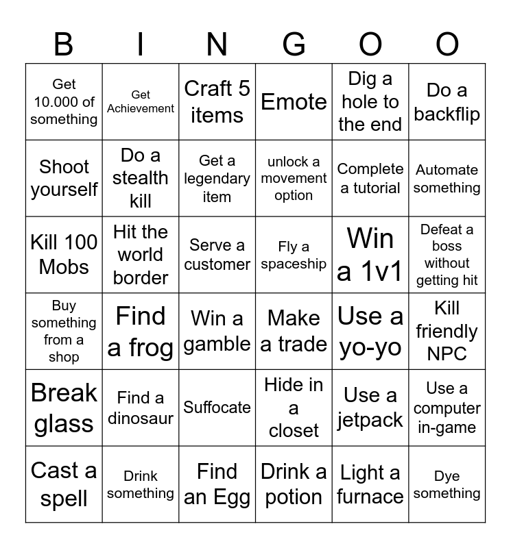 This bingo card has 50 words: Have a full inventory, Kill 100 Mobs, Die to fall damage, Use a yo-yo, Win a 1v1, Drink something, Get Achievement, do math, Do a backflip, Find an Egg, Shoot yourself, Emote, Find a frog, Buy something from a shop, Go through a portal, Hide in a closet, Do a stealth kill, Hit the world border, Crit something, Dig a hole to the end, Automate something, Kill friendly NPC, Get 10.000 of something, Get a legendary item, Fully explore a map, Break glass, unlock a movement option, Get an accessory, Craft 5 items, Defeat a boss without getting hit, Make your character look like you, Use a jetpack, Catch a fish, Win a battle royal, Make a trade, Suffocate, Drink a potion, Light a furnace, Dye something, Serve a customer, Cast a spell, Glitch out of bounds, Use a computer in-game, Fire something into the air, Win a gamble, Complete a tutorial, Find a dinosaur, Commit a crime, Fly a spaceship and Get jumpscared.