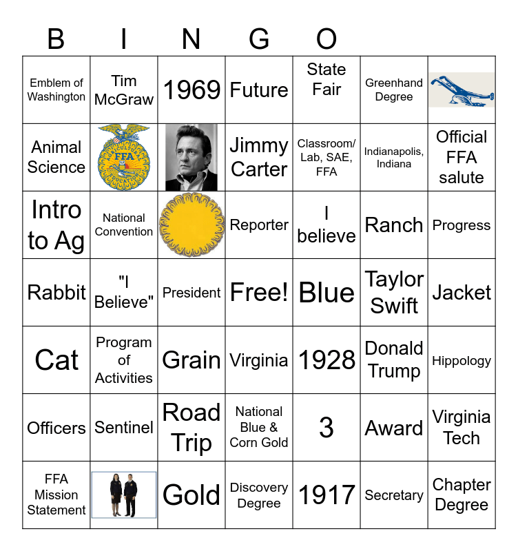 This bingo card has 9 images, a free space and 75 words: Creed, National Blue & Corn Gold, 1969, Stationed by the Rising Sun, E.M. Tiffany, Sentinel, Officers, Discovery Degree, Veterinary Science, Official FFA salute, Emblem of Washington, Progress, Greenhand Degree, Virginia, Hippology, Indianapolis, Indiana, Creed Speaking, Classroom/ Lab, SAE, FFA, 1,042,245, 1917, 1988, State Degree, Official FFA Greeting, American Degree, 1928, Jimmy Carter, Chapter Degree, Taylor Swift, "I Believe", New Horizons, National Convention, Program of Activities, Donald Trump, 1965, Bo Jackson, FFA Mission Statement, Virginia Tech, Tim McGraw, 3, Cow, Oat Hay, Grain, I believe, Future, Advisor, Ag Issues, People in Ag, Rabbit, Animal Science, Equine Science, Intro to Ag, Vet Science, Ag Engineering, Banquet, American Degree, Dog, Cat, Aquaculture, Workshop, State Fair, Plow, Ranch, Competition, Award, Sentinel, Reporter, President, Vice President, Secretary, Treasurer, Jacket, Blue, Gold, Road Trip and Mountains.