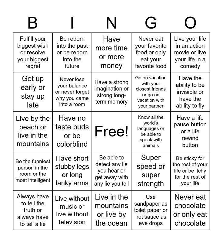 This bingo card has a free space and 24 words: Have short stubby legs or long lanky arms, Live without music or live without television, Have a strong imagination or strong long-term memory, Always have to tell the truth or always have to tell a lie, Live your life in an action movie or live your life in a comedy, Fulfill your biggest wish or resolve your biggest regret, Get up early or stay up late, Be reborn into the past or be reborn into the future, Know all the world's languages or be able to speak with animals, Be able to detect any lie you hear or get away with any lie you tell, Go on vacation with your closest friends or go on vacation with your partner, Live by the beach or live in the mountains, Super speed or super strength, Be sticky for the rest of your life or be itchy for the rest of your life, Never lose your balance or never forget why you came into a room, Use sandpaper as toilet paper or hot sauce as eye drops, Have a life pause button or a life rewind button, Have more time or more money, Have the ability to be invisible or have the ability to fly, Have no taste buds or be colorblind, Never eat chocolate or only eat chocolate, Be the funniest person in the room or the most intelligent, Never eat your favorite food or only eat your favorite food and Live in the mountains or live by the ocean.