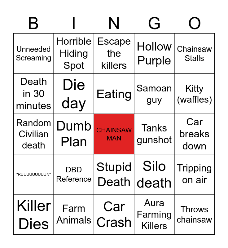 This bingo card has a free space and 24 words: Killer Dies, DBD Reference, Eating, Aura Farming Killers, Chainsaw Stalls, Unneeded Screaming, Horrible Hiding Spot, Escape the killers, Tanks gunshot, Car breaks down, Random Civilian death, Die day, Silo death, Tripping on air, Death in 30 minutes, Farm Animals, Car Crash, Hollow Purple, Kitty (waffles), "RUUUUUUUUUN", Dumb Plan, Stupid Death, Samoan guy and Throws chainsaw.