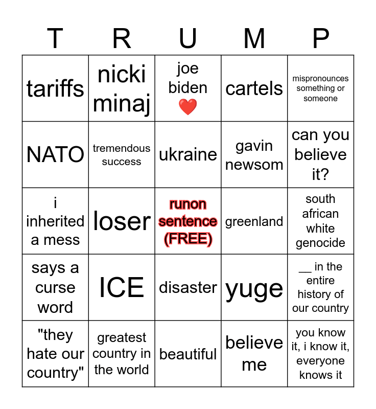 This bingo card has a free space and 24 words: ICE, greatest country in the world, ukraine, "they hate our country", mispronounces something or someone, tariffs, NATO, nicki minaj, greenland, disaster, gavin newsom, i inherited a mess, yuge, __ in the entire history of our country, tremendous success, believe me, south african white genocide, joe bidenβ€οΈ, can you believe it?, loser, you know it, i know it, everyone knows it, says a curse word, cartels and beautiful.