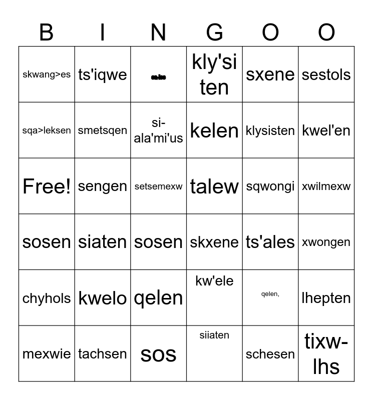 This bingo card has 36 words: kw'ele, qelen, siiaten, sqa>leksen, sosen, talew, smetsqen, sos, sxene, qelen,, kwel'en, kly'si ten, lhepten, sengen, kelen, skwang>es, chyhols, sqwongi, Free!, sa-les, setsemexw, siaten, skxene, sosen, ts'ales, ts'iqwe, klysisten, tachsen, si-ala'mi'us, sestols, tixw-lhs, mexwie, xwongen, xwilmexw, kwelo and schesen.