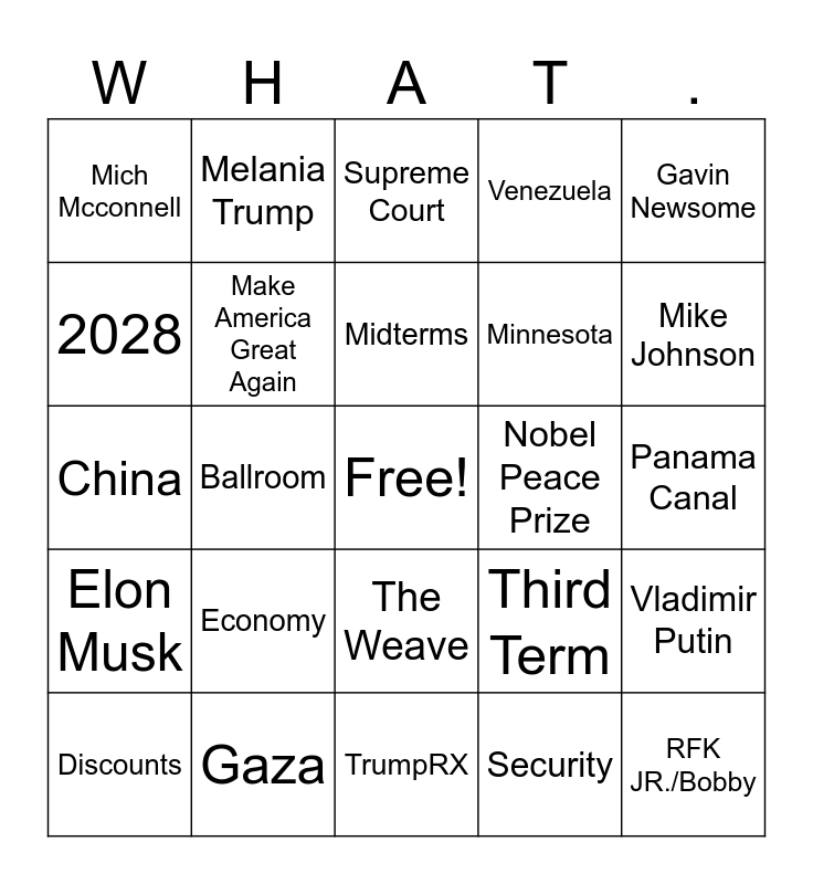 This bingo card has a free space and 48 words: 8 Wars, RFK JR./Bobby, CANADA, TrumpRX, Economy, Greenland, Melania Trump, Border, 2028, Joe Biden, Make America Great Again, Venezuela, Vladimir Putin, Third Term, Impeachment, Chuck Schumer, Midterms, Nobel Peace Prize, Tariffs, Gavin Newsome, Ballroom, Security, Mich Mcconnell, Minnesota, Autopen, Mike Johnson, Discounts, Hillary Clinton, The Weave, Elon Musk, Charlie Kirk, Affordability, Mexico, Barack Obama, Gaza, DOW, Epstein Files, Panama Canal, Nacy Pelosi, Transgender, JD Vance, Cuba, Supreme Court, Democratic Heckler, China, Iran, Illegal Immigrants and Unrelated Tangent.