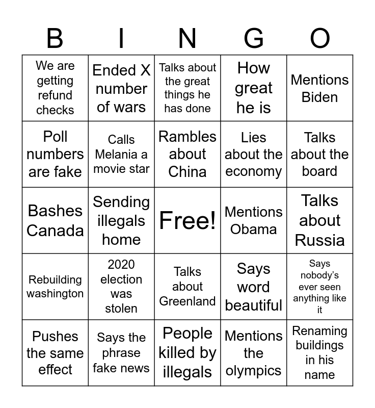 This bingo card has a free space and 24 words: 2020 election was stolen, Says the phrase fake news, Rambles about China, Pushes the same effect, Mentions Biden, We are getting refund checks, Poll numbers are fake, Ended X number of wars, Mentions Obama, Talks about Greenland, Lies about the economy, Bashes Canada, Says word beautiful, Says nobody’s ever seen anything like it, Calls Melania a movie star, Mentions the olympics, Talks about Russia, Talks about the great things he has done, Talks about the board, Sending illegals home, Renaming buildings in his name, Rebuilding washington, How great he is and People killed by illegals.