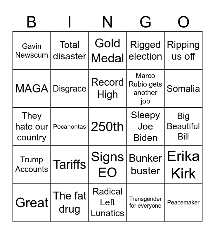 This bingo card has 25 words: Tariffs, Radical Left Lunatics, Record High, Great, Ripping us off, Gavin Newscum, MAGA, Total disaster, Sleepy Joe Biden, Signs EO, Marco Rubio gets another job, They hate our country, Bunker buster, Erika Kirk, Disgrace, Peacemaker, Big Beautiful Bill, Gold Medal, Somalia, Pocahontas, 250th, The fat drug, Trump Accounts, Rigged election and Transgender for everyone.