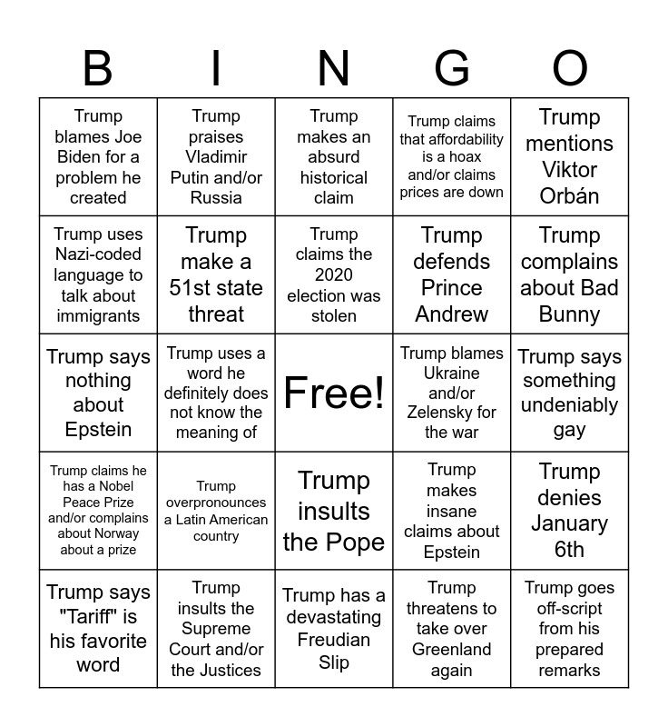 This bingo card has a free space and 24 words: Trump overpronounces a Latin American country, Trump insults the Supreme Court and/or the Justices, Trump claims the 2020 election was stolen, Trump says "Tariff" is his favorite word, Trump mentions Viktor Orbán, Trump blames Joe Biden for a problem he created, Trump uses Nazi-coded language to talk about immigrants, Trump praises Vladimir Putin and/or Russia, Trump blames Ukraine and/or Zelensky for the war, Trump insults the Pope, Trump defends Prince Andrew, Trump says nothing about Epstein, Trump makes insane claims about Epstein, Trump denies January 6th, Trump make a 51st state threat, Trump threatens to take over Greenland again, Trump says something undeniably gay, Trump makes an absurd historical claim, Trump complains about Bad Bunny, Trump uses a word he definitely does not know the meaning of, Trump goes off-script from his prepared remarks, Trump claims he has a Nobel Peace Prize and/or complains about Norway about a prize, Trump claims that affordability is a hoax and/or claims prices are down and Trump has a devastating Freudian Slip.
