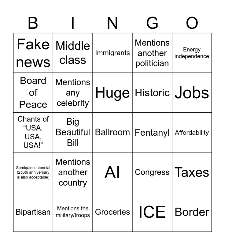 This bingo card has 25 words: Mentions another country, Groceries, Huge, Bipartisan, Energy independence, Fake news, Board of Peace, Middle class, Fentanyl, AI, Historic, Chants of “USA, USA, USA!”, Congress, Taxes, Mentions any celebrity, Border, Affordability, Immigrants, Jobs, Big Beautiful Bill, Ballroom, Mentions the military/troops, Semiquincentennial (250th anniversary is also acceptable), Mentions another politician and ICE.