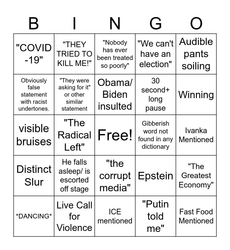 This bingo card has a free space and 24 words: He falls asleep/ is escorted off stage, Live Call for Violence, Obama/ Biden insulted, *DANCING*, Audible pants soiling, "COVID -19", Obviously false statement with racist undertones., "THEY TRIED TO KILL ME!", Gibberish word not found in any dictionary, "the corrupt media", 30 second+ long pause, visible bruises, Epstein, "The Greatest Economy", "They were asking for it" or other similar statement, "Putin told me", Ivanka Mentioned, "Nobody has ever been treated so poorly", Winning, "The Radical Left", Fast Food Mentioned, Distinct Slur, "We can't have an election" and ICE mentioned.