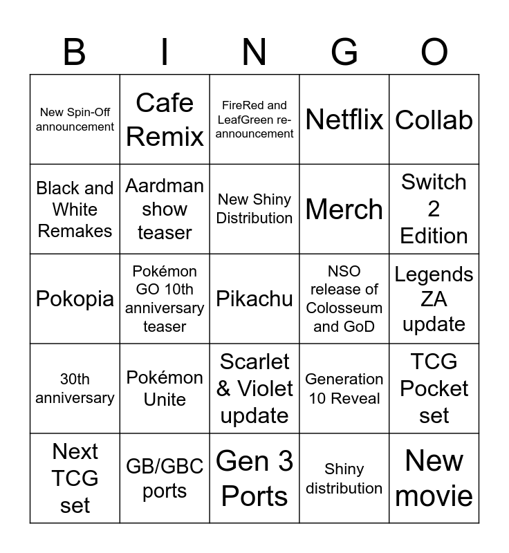 This bingo card has a free space and 24 words: Pokémon Unite, GB/GBC ports, New Shiny Distribution, Next TCG set, Collab, New Spin-Off announcement, Black and White Remakes, Cafe Remix, NSO release of Colosseum and GoD, Scarlet & Violet update, Merch, Pokopia, Generation 10 Reveal, TCG Pocket set, Aardman show teaser, Shiny distribution, Legends ZA update, FireRed and LeafGreen re-announcement, Switch 2 Edition, Pokémon GO 10th anniversary teaser, New movie, 30th anniversary, Netflix and Gen 3 Ports.