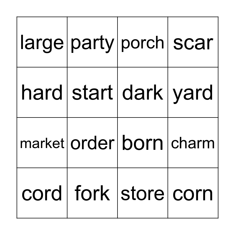 This bingo card has 20 words: charm, north, porch, spark, cord, hard, fork, large, market, party, order, born, start, corn, dark, storm, yard, scar, store and thorn.