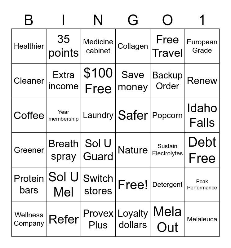 This bingo card has 36 words: Free!, Switch stores, Loyalty dollars, Cleaner, Greener, Safer, Extra income, Provex Plus, Free Travel, Detergent, Renew, Collagen, Peak Performance, Year membership, Save money, Healthier, Protein bars, Popcorn, Coffee, Medicine cabinet, Laundry, Breath spray, Nature, Sol U Guard, Sustain Electrolytes, 35 points, Backup Order, Refer, $100 Free, European Grade, Melaleuca, Wellness Company, Debt Free, Idaho Falls, Sol U Mel and Mela Out.