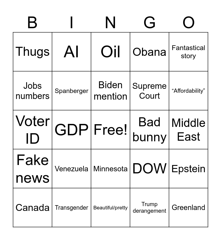 This bingo card has a free space and 24 words: Venezuela, Transgender, Biden mention, Canada, Fantastical story, Thugs, Jobs numbers, AI, Bad bunny, Minnesota, Supreme Court, Voter ID, DOW, Epstein, Spanberger, Trump derangement, Middle East, Oil, “Affordability”, GDP, Greenland, Fake news, Obana and Beautiful/pretty.