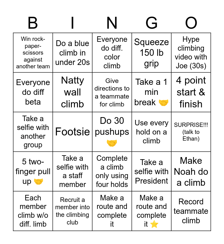 This bingo card has 33 words: Record teammate climb, Complete another team's route, Footsie, 20 pull ups 🤝, 5 two-finger pull up 🤝, Natty wall climb, Hype climbing video with Joe (30s), Each member climb w/o diff. limb, Do a blue climb in under 20s, Everyone finish a climb in under 1:30 🤝, Give directions to a teammate for climb, Everyone do diff. color climb, Create a team name, Deadhang crimp board 60s 🤝, Use every hold on a climb, 4 point start & finish, Recruit a member into the climbing club, Take a selfie with another group, Take a selfie with a staff member, Take a selfie with President, Complete a climb only using four holds, Follow @LSUClimbing, Win rock-paper-scissors against another team, SURPRISE!!! (talk to Ethan), Make a route and complete it, Do 30 pushups 🤝, Squeeze 150 lb grip, Take a 1 min break 🤝, Everyone do diff beta, Make Noah do a climb, Hype climbing video with Joe (30s) ⭐, Make a route and complete it ⭐ and Complete another team's route ⭐.