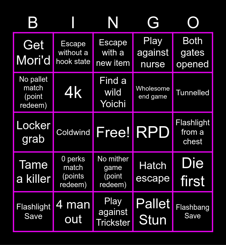 This bingo card has a free space and 24 words: 0 perks match (points redeem), 4 man out, Find a wild Yoichi, Flashlight Save, Both gates opened, Get Mori'd, No pallet match (point redeem), Escape without a hook state, RPD, No mither game (point redeem), Wholesome end game, Locker grab, Hatch escape, Die first, 4k, Pallet Stun, Flashlight from a chest, Escape with a new item, Tunnelled, Coldwind, Flashbang Save, Tame a killer, Play against nurse and Play against Trickster.