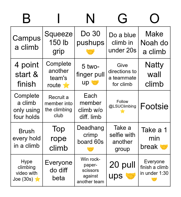 This bingo card has 32 words: 20 pull ups 🤝, Take a selfie with President, Recruit a member into the climbing club, Everyone do diff. color climb, Brush every hold in a climb, Complete another team's route ⭐, Make Noah do a climb, Take a 1 min break 🤝, Squeeze 150 lb grip, Everyone finish a climb in under 1:30 🤝, 5 two-finger pull up 🤝, Do 30 pushups 🤝, Create a team name ⭐, Take a selfie with a staff member, Follow @LSUClimbing ⭐, Make a route and complete it ⭐, Hype climbing video with Joe (30s) ⭐, Complete a climb only using four holds, Deadhang crimp board 60s 🤝, Top rope climb, Take a selfie with another group, Use every hold on a climb, Footsie, Everyone do diff beta, Each member climb w/o diff. limb, Do a blue climb in under 20s, Give directions to a teammate for climb, 4 point start & finish, Campus a climb, Win rock-paper-scissors against another team, Record teammate climb and Natty wall climb.