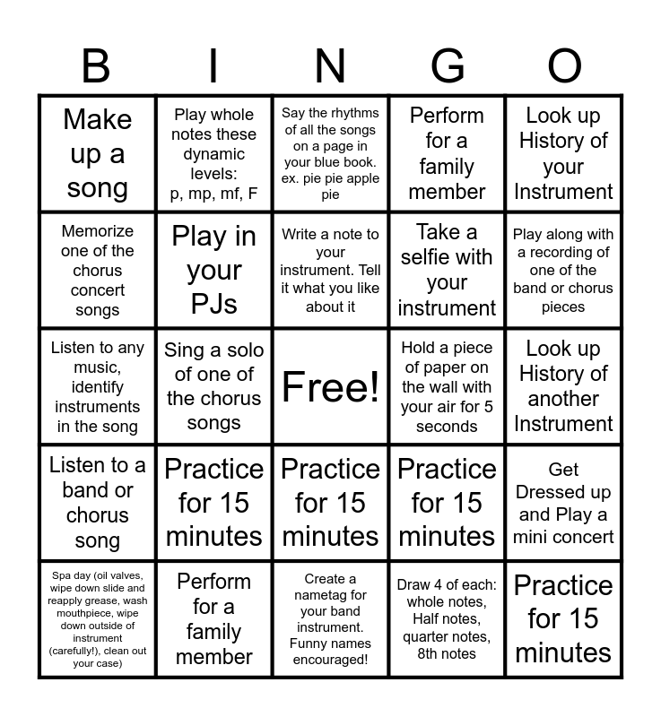 This bingo card has a free space and 24 words: Practice for 15 minutes, Perform for a family member, Write a note to your instrument. Tell it what you like about it, Spa day (oil valves, wipe down slide and reapply grease, wash mouthpiece, wipe down outside of instrument (carefully!), clean out your case), Look up History of your Instrument, Make up a song, Memorize one of the chorus concert songs, Play whole notes these dynamic levels: p, mp, mf, F, Hold a piece of paper on the wall with your air for 5 seconds, Practice for 15 minutes, Take a selfie with your instrument, Listen to any music, identify instruments in the song, Practice for 15 minutes, Get Dressed up and Play a mini concert, Play in your PJs, Draw 4 of each: whole notes, Half notes, quarter notes, 8th notes, Look up History of another Instrument, Say the rhythms of all the songs on a page in your blue book. ex. pie pie apple pie, Play along with a recording of one of the band or chorus pieces, Sing a solo of one of the chorus songs, Practice for 15 minutes, Listen to a band or chorus song, Perform for a family member and Create a nametag for your band instrument. Funny names encouraged!.