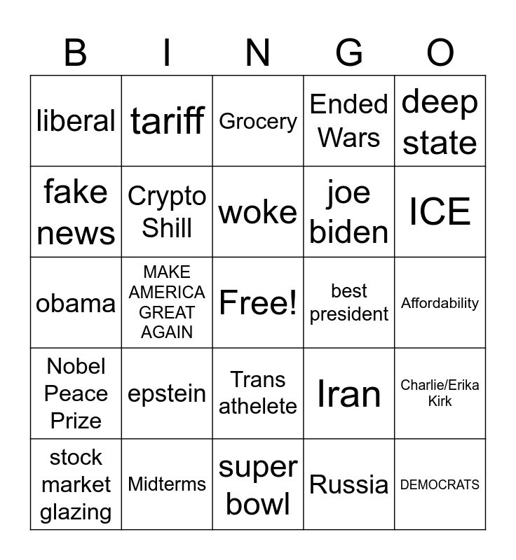 This bingo card has a free space and 25 words: epstein, super bowl, woke, stock market glazing, deep state, liberal, fake news, tariff, best president, Trans athelete, joe biden, obama, Iran, Charlie/Erika Kirk, Crypto Shill, Supreme Court, Affordability, Grocery, ICE, MAKE AMERICA GREAT AGAIN, DEMOCRATS, Midterms, Nobel Peace Prize, Ended Wars and Russia.