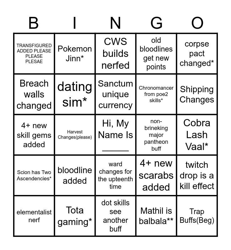 This bingo card has a free space and 24 words: bloodline added, Tota gaming*, Sanctum unique currency, elementalist nerf, corpse pact changed*, TRANSFIGURED ADDED PLEASE PLEASE PLESAE, Breach walls changed, Pokemon Jinn*, non-brineking major pantheon buff, ward changes for the upteenth time, Chronomancer from poe2 skills*, 4+ new skill gems added, 4+ new scarabs added, twitch drop is a kill effect, dating sim*, Mathil is balbala**, Cobra Lash Vaal*, CWS builds nerfed, Shipping Changes, Harvest Changes(please), Trap Buffs(Beg), Scion has Two Ascendencies*, old bloodlines get new points and dot skills see another buff.