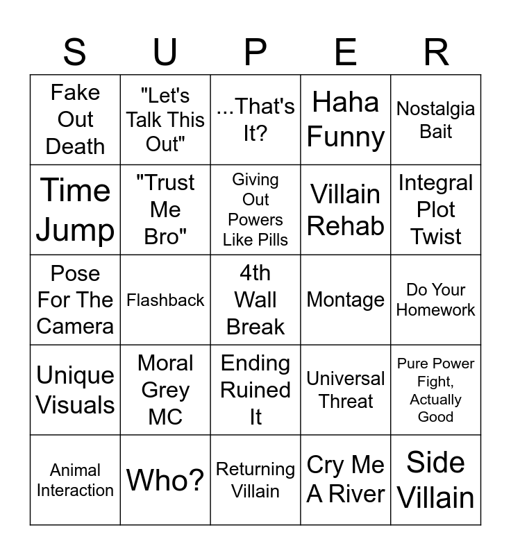 This bingo card has 67 words: Sequel Bait, Predicted Dialogue, Are We Forgetting Something?, Pure Power Fight, Actually Good, "I am...", This is Disney?!?, Big Sacrifice, "Let's Talk This Out", Power of Friendship, Giving Out Powers Like Pills, 2 or More Side Plots, Character Cameo, Ending Ruined It, A Word From Our Sponsor, Do Your Homework, Nostalgia Bait, Central Character Death, Time Jump, Flashback, Fake Out Death, Substantial Power Gain, Villain Rehab, Moral Grey MC, Unique Visuals, Haha Funny, Cry Me A River, Interesting Accent, Integrated Music, Get a Room, Side Character Focus, Integral Plot Twist, Gotta Keep That PG-13, 4th Wall Break, Pop Culture Reference, Who's Gonna Pay For All This?, Another Language, Political Take, Animal Interaction, Quick & Easy Costume Change, Universal Threat, Pose For The Camera, Side Villain, Introduction of Major MCU Character, "Trust Me Bro", Montage, Up In Flames, Exposition Dump, Quirky Side Character, Cool Shot, Who?, Goosebumps, Bad CGI, ...That's It?, Holy CG, Slow-Mo, Aura Farm, Cliche Line, Returning Villain, Tell Don't Show, Too serious, funny time, Important Lesson, Sexual Innuendo, Oops! All Jokes!, Hello Fellow Teens!, Voice Over, Stupid Decision, Ragebait, Can't They Just...? and Unlikely Teamup.