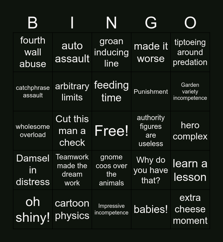 This bingo card has a free space and 26 words: gnome coos over the animals, babies!, feeding time, cartoon physics, tiptoeing around predation, fourth wall abuse, catchphrase assault, auto assault, hero complex, Why do you have that?, Punishment, wholesome overload, learn a lesson, oh shiny!, Cut this man a check, this was your fault, made it worse, Damsel in distress, groan inducing line, extra cheese moment, Garden variety incompetence, Impressive incompetence, authority figures are useless, Teamwork made the dream work, arbitrary limits and Unnecessary villain.