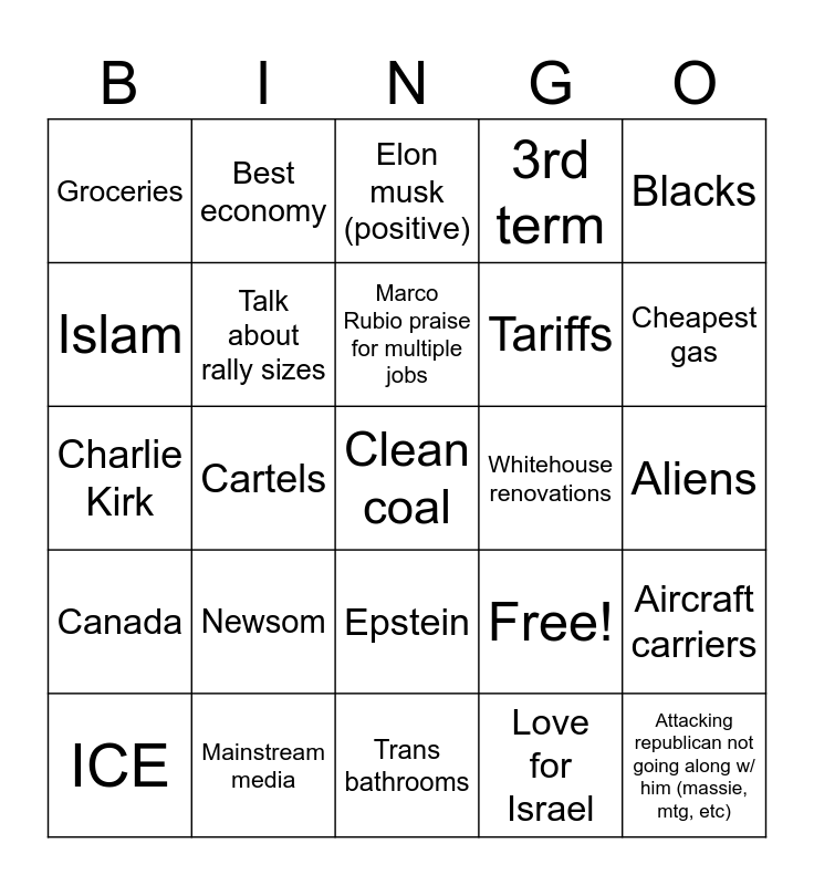 This bingo card has 25 words: Newsom, Trans bathrooms, Marco Rubio praise for multiple jobs, ICE, Blacks, Groceries, Islam, Best economy, Whitehouse renovations, Epstein, Tariffs, Charlie Kirk, Free!, Aircraft carriers, Talk about rally sizes, Attacking republican not going along w/ him (massie, mtg, etc), Aliens, Elon musk (positive), Cheapest gas, Cartels, Clean coal, Mainstream media, Canada, 3rd term and Love for Israel.