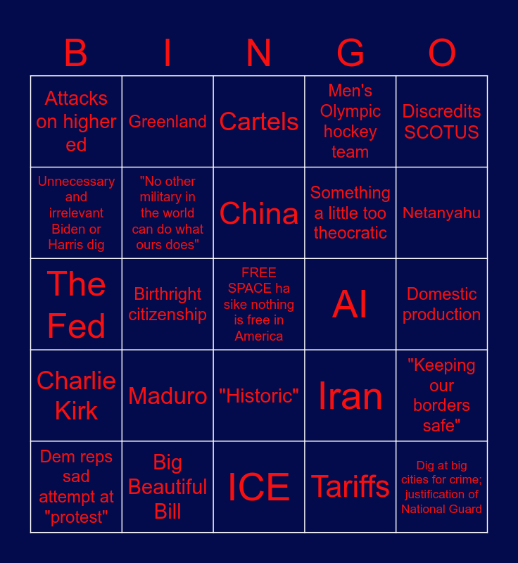 This bingo card has a free space and 24 words: Maduro, Big Beautiful Bill, China, Dem reps sad attempt at "protest", Discredits SCOTUS, Attacks on higher ed, Unnecessary and irrelevant Biden or Harris dig, Greenland, AI, "Historic", Something a little too theocratic, The Fed, Iran, "Keeping our borders safe", "No other military in the world can do what ours does", Tariffs, Domestic production, Cartels, Netanyahu, Birthright citizenship, Dig at big cities for crime; justification of National Guard, Charlie Kirk, Men's Olympic hockey team and ICE.