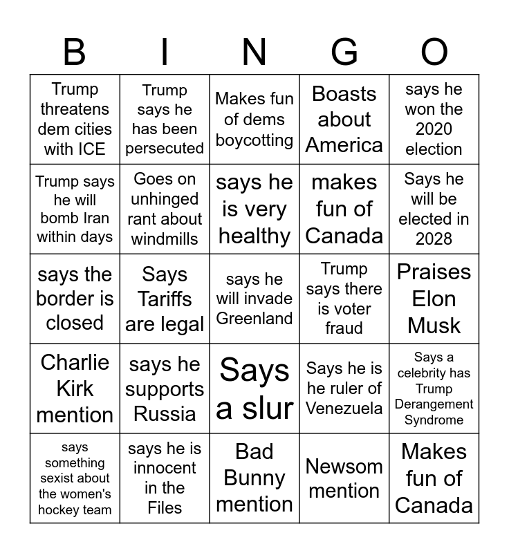 This bingo card has a free space and 24 words: says he supports Russia, says he is innocent in the Files, says he is very healthy, says something sexist about the women's hockey team, says he won the 2020 election, Trump threatens dem cities with ICE, Trump says he will bomb Iran within days, Trump says he has been persecuted, Trump says there is voter fraud, Says a slur, makes fun of Canada, says the border is closed, Says he is he ruler of Venezuela, Says a celebrity has Trump Derangement Syndrome, Goes on unhinged rant about windmills, Newsom mention, Praises Elon Musk, Makes fun of dems boycotting, Says he will be elected in 2028, Says Tariffs are legal, Makes fun of Canada, Charlie Kirk mention, Boasts about America and Bad Bunny mention.
